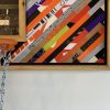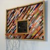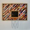 Medium: up-cycled, hand cut Nike shoe boxes spanning 3 decades, basketball hoop, chain net, treated cedar wood, on wood. Ready to hang.