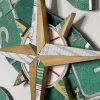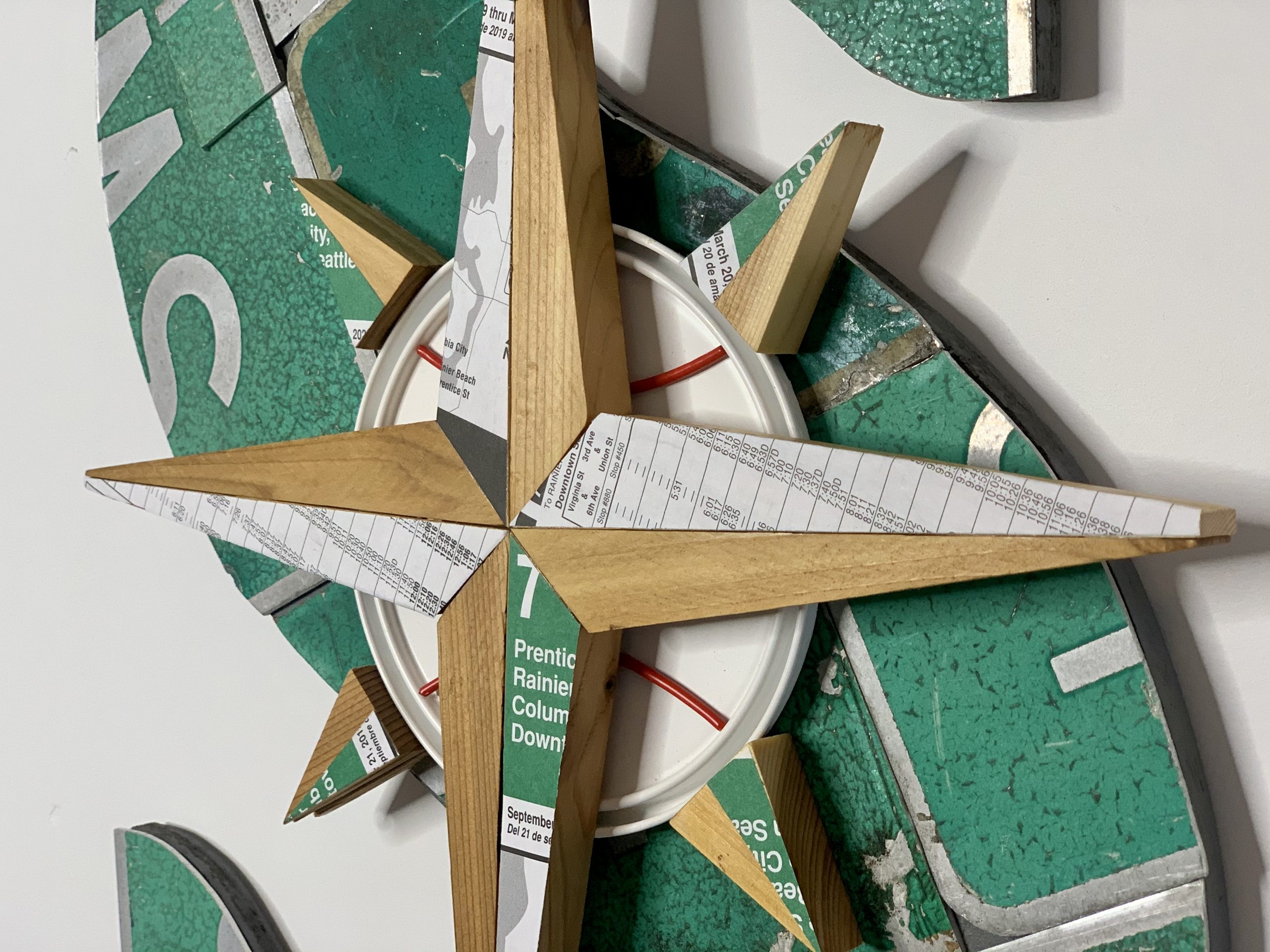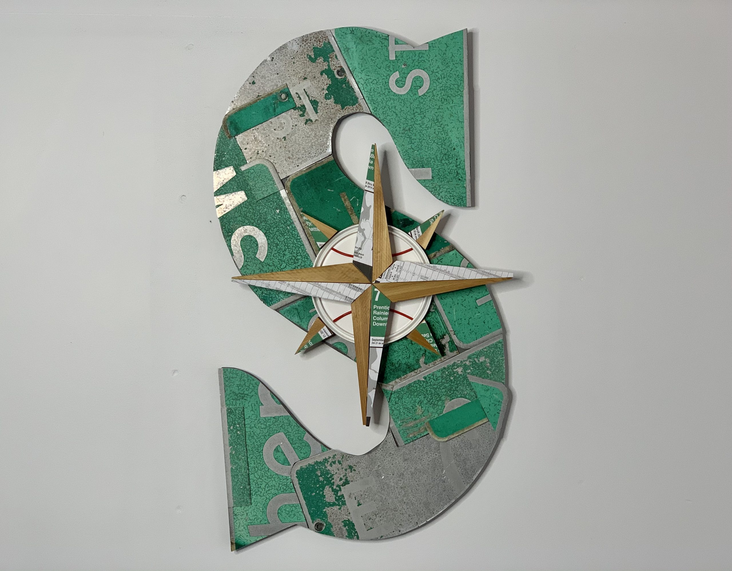 Medium: up-cycled Seattle street signs, Metro bus #7 pamphlet, paint can lid and holder, treated cedar wood, on wood. Ready to hang.