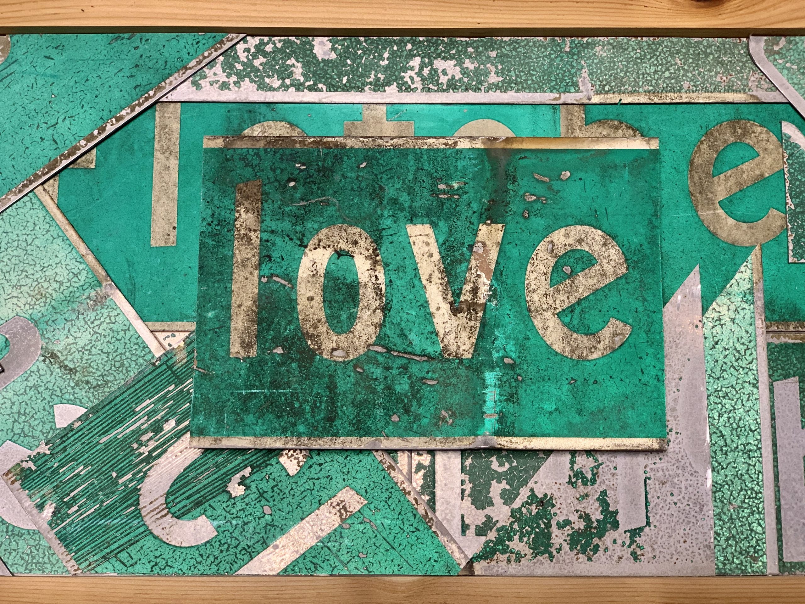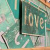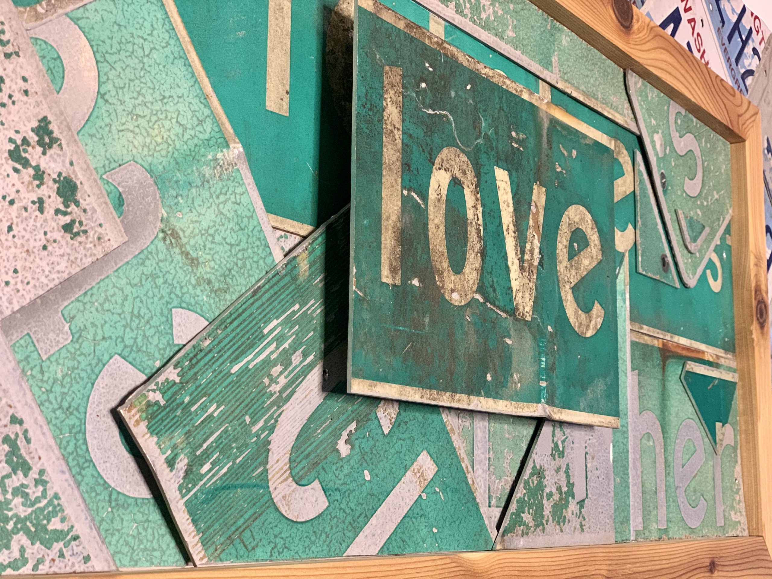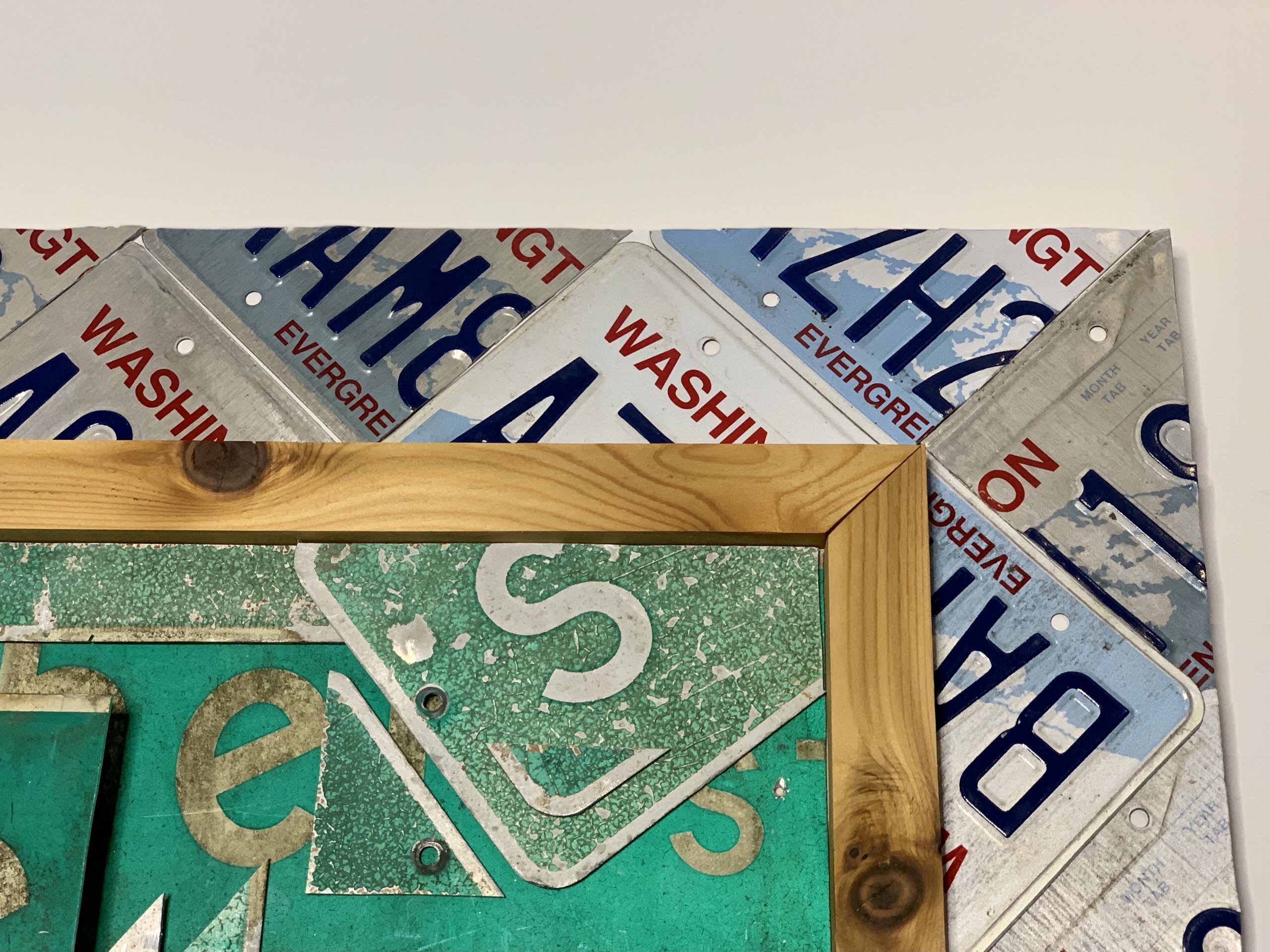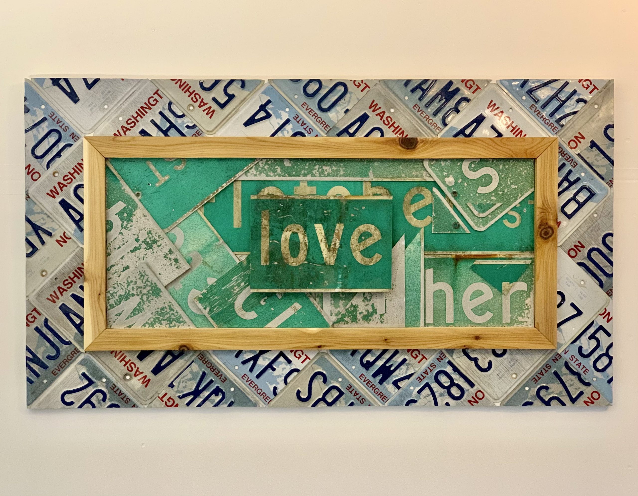 Medium: up-cycled Seattle street signs, up-cycled Washington license plates, treated cedar wood, on wood. Ready to hang.
